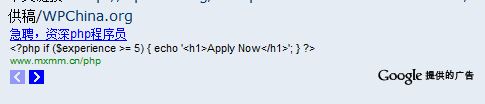 2、第一次看到google的广告推送中,有诚招PHP高手,而且,输出的是一段代码,灰常意外 。可惜,虽然这种招聘很有创意,但是,招聘的条件却和其他公司如出一辙,都是要求这个人精通这个精通那个,要会切图,会写HTML。。。。玄啊