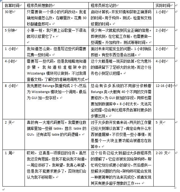 一个曾经与我一起工作过的经验丰富的项目经理声称,他拿到程序员的时间估算以后,先将它乘以π,然后转化下一个时间数量级后,才能得到真正的值。1 天转化成3.14周。他过去因为程序员不擅长估算时间而吃尽了苦头。我创建了一个用来翻译程序员时间估算的表格,来尽量缩小估算错误。