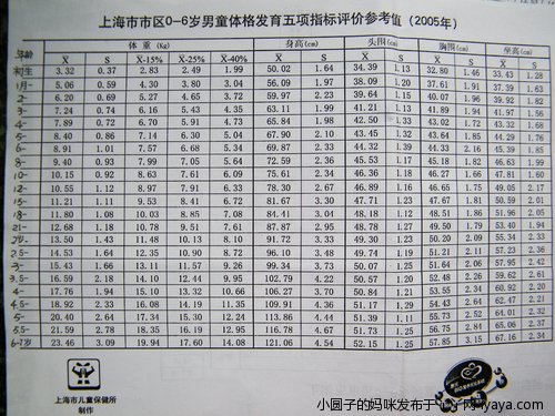 虽然图片上写的是05年的,但好象现在的医院还是以此为标准。如果你看到的值与你小孩的现值不太一样,不要太惊讶,现在的小孩,营养丰富了。总归是会有点变化的嘛。。。